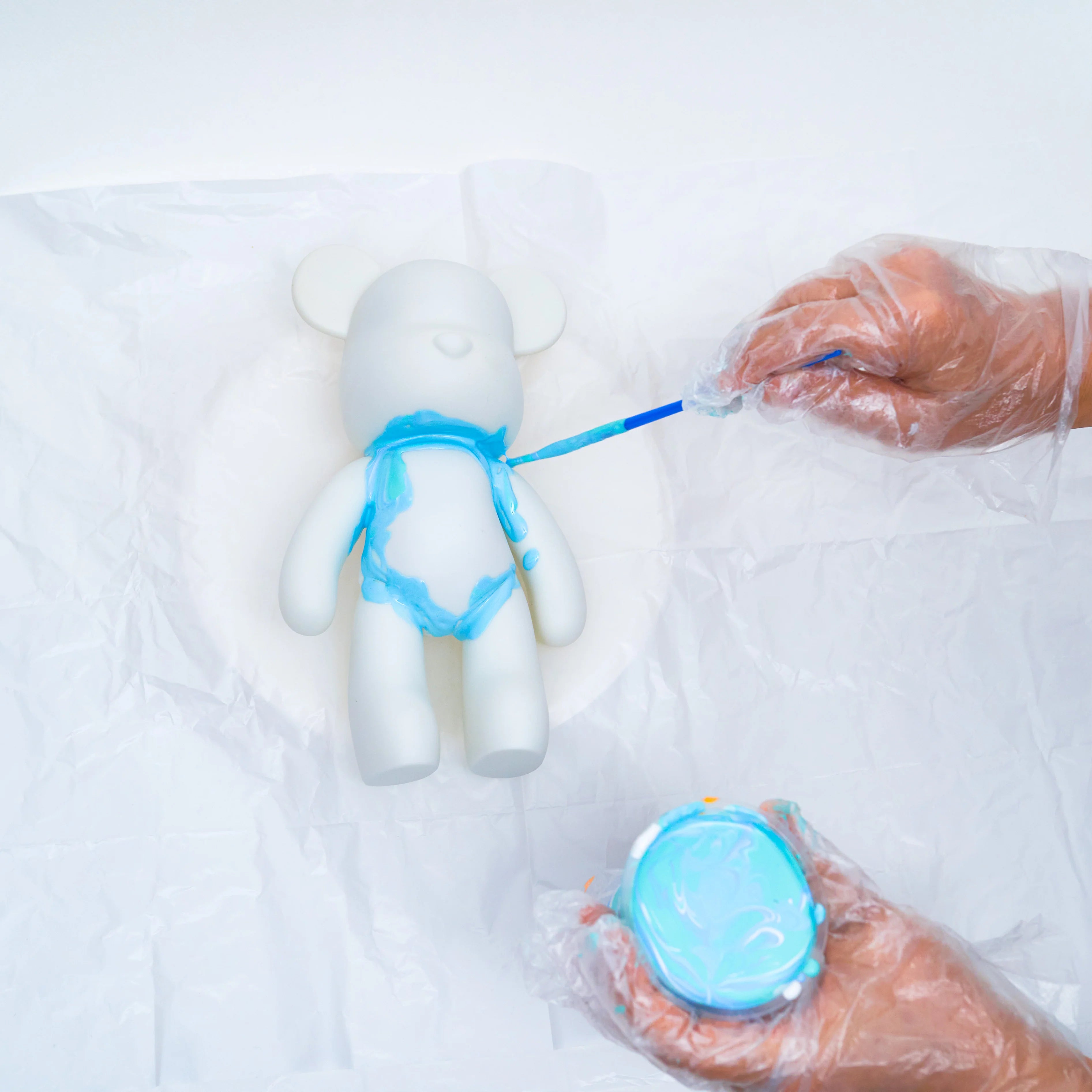 Begin met het aanbrengen van de verf op de nek, de binnenkant van de armen, benen en gewrichten. Zo zorg je ervoor dat alle details goed bedekt zijn voordat je verder gaat met de rest van je beertje.